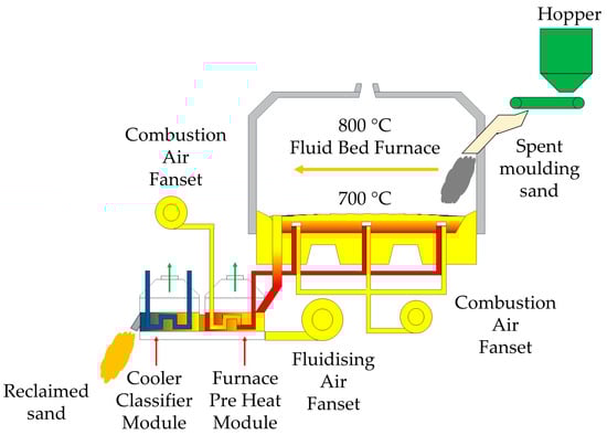 - Zanetti, M.C.; Fiore, S. Industrial treatment processes for recycling of green foundry sands. Int. J. Cast Met. Res. 2008, 21, 435–438. [Google Scholar]