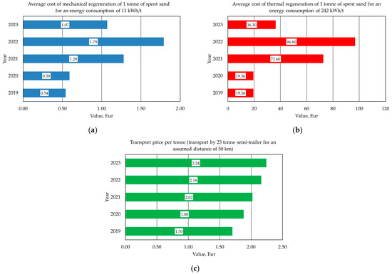 The data presented in Table 1, Table 2, Table 3, Table 4 and Table 5 (Figure 3) are approximate values resulting from the individual policies of the individual companies that: supply foundry sands, accept waste at landfills, provide transport services, and also supply electricity or gas. In many cases, these are individually negotiated prices for each component of the reclamation costs. The values presented in the tables determine the level of the various regeneration cost components and provide a starting point for the analysis of the evaluation of sustainability aspects.