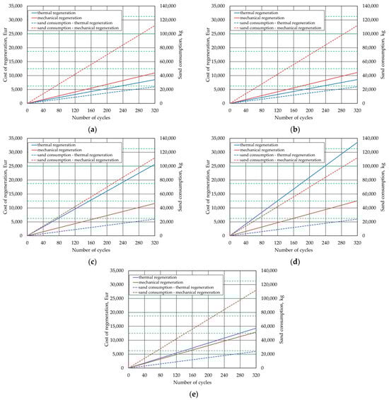 Mechanical and thermal regeneration price relationships and fresh sand consumption for successive regeneration cycles of 1 tonne of spent moulding sand: (a) in 2019, (b) in 2020, (c) in 2021, (d) in 2022, and (e) in 2023 (the green dotted line indicates fresh sand supply for mechanical regeneration).