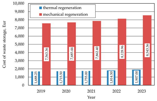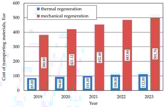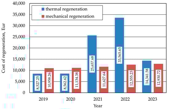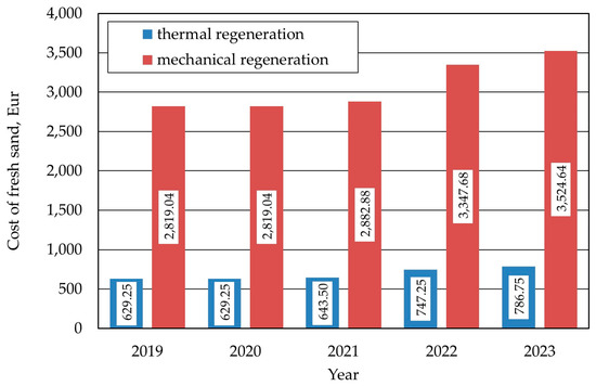 Based on the data summarised in Table 7, Table 8, Table 9, Table 10 and Table 11, estimates of the regeneration costs for 320 cycles were made, which corresponds to the consumption by thermal regeneration consumption of a single delivery of 25 tonnes of fresh sand in the foundry, assuming an equipment output of 1 t/h. The results are shown for individual years in Figure 6.