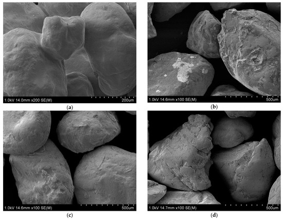 Scanning images of matrix grains at magnification ×100: (a) bound furan mass after crushing, (b) spent moulding sand, (c) spent moulding sand after mechanical regeneration, and (d) spent moulding sand after thermal regeneration.