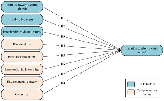 Research considers behavioural intention as a proxy for behaviour and posits that behavioural intention is an essential driver of actual behaviour [18]. Understanding the adoption intention for electric aircraft, an emerging technology with significant potential to reduce emissions, is crucial for advancing sustainable practices in aviation. However, the existing literature indicates that there is a significant paucity of research focusing on the intentions of air travellers to adopt electric aircraft [15,17,19,20,21]. This gap is particularly noteworthy given the increasing importance of sustainable transportation solutions in the aviation industry. Understanding passenger adoption intentions is critical for designing effective strategies to encourage the transition to electric aircraft, which are pivotal for reducing the environmental impact of air travel. To address this research gap, the present study aims to investigate the determinants influencing air travellers’ intentions to adopt electric aircraft, by extending the framework of the theory of planned behaviour (TPB).