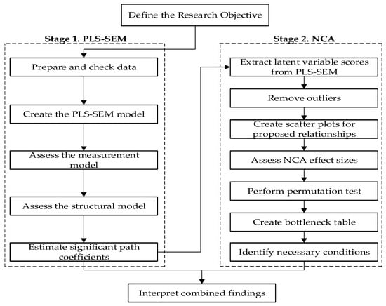 This study presents a multi-method methodology that examines the formation of electric aircraft adoption intentions from both sufficiency and necessity logics. The flowchart of the proposed multi-method approach is depicted step by step in Figure 2. The first stage uses SEM for sufficiency analysis, followed by NCA for necessity analysis in the second stage. SEM is traditionally used to estimate hypothesized relationships. The SEM methodology is divided into two types: covariance-based SEM (CB-SEM) and variance-based SEM, known as partial least squares SEM (PLS-SEM). CB-SEM aims to minimize the difference between observed and implied covariance matrices, while PLS-SEM maximizes the explained variance of endogenous (dependent) latent variables [91]. PLS-SEM allows for the effective examination of causal-predictive relationships and provides higher predictive accuracy [27,30]. Furthermore, the latent construct scores produced by PLS-SEM are often used for subsequent analyses such as segmentation or prediction [102].