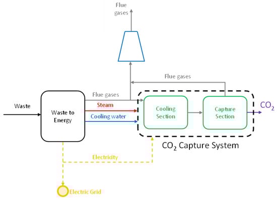 Flow diagram of CO2 capture system integrated with a WtE incineration plant.