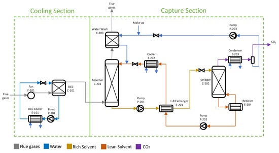 Figure 2 shows in detail the components present in each section. The cooling section includes two circuits: a primary one dedicated to cooling the flue gases (in grey) and a secondary one used for the cold water (in blue). The main component is the Direct Contact Cooler (DCC, C-101), in which the water from the secondary circuit is used to lower the temperature of the flue gas (directed toward the absorber). The water that exits the DCC is then cooled via a local cooling circuit. In the capture section, the system includes two main components: the absorber (C-201) and the stripper (C-202). In the absorber (C-201), the carbon dioxide is transferred from the vapor/gas phase to the liquid by the reaction between the CO2 and the solvent. In the stripper (C-202), on the other hand, a reverse reaction regenerates the solvent, and CO2 is transferred back to the gaseous phase. A cross heat-exchanger (E-201) interconnects the two main components. This configuration differs from the classic absorption–regeneration process used in the literature [36,37,38,39,40,41] since the water from the condenser (E-203) is not recycled back to the top of the stripper as reflux but is instead directed to the water-wash (C-203). This choice is motivated by energy-saving reasons, which is in line with Madeddu et al. [42] and Oexmann and Kather [43]. Then, the CO2 captured is directed to the following section.
