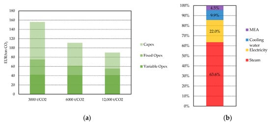 (a) Cost of CO2 captured: capital cost (Capex) alongside operational costs (Opex), both fixed and variable, at different capture capacities. (b) Variable Opex costs: percentages indicating the cost contributions of MEA, cooling water, electricity, and steam to the overall variable Opex for CO2 capture.