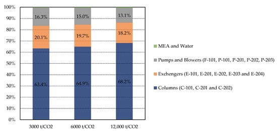 Figure 4 presents the allocation of Capex for the different equipment within the CO2 capture system at three sizes. The analysis shows a distinct trend in Capex distribution as capacity increases. The proportion of Capex for columns C-101, C-201, and C-202 increases significantly, indicating a more substantial capital investment at larger scales, increasing from 63.4% to 68.2%. Exchangers (E-101, E-201, E-202, E-203, and E-204) and pumps and blowers (F-101, P-101, P-201, P-202, P-203) demonstrate a relatively stable Capex share, with slight decreases from 20.1% to 18.2% and 16.3% to 13.1%, respectively. The costs for MEA and the water used to fill the circuit are so negligible that they do not markedly affect the overall Capex distribution. The distribution of Capex, as depicted in Figure 4, indicates the varying cost implications of scaling up components in CO2 capture systems, providing essential guidance for capital allocation decisions in the design and expansion of such facilities, aligning with literature that highlights the absorber and stripper as the most costly components [42,70].