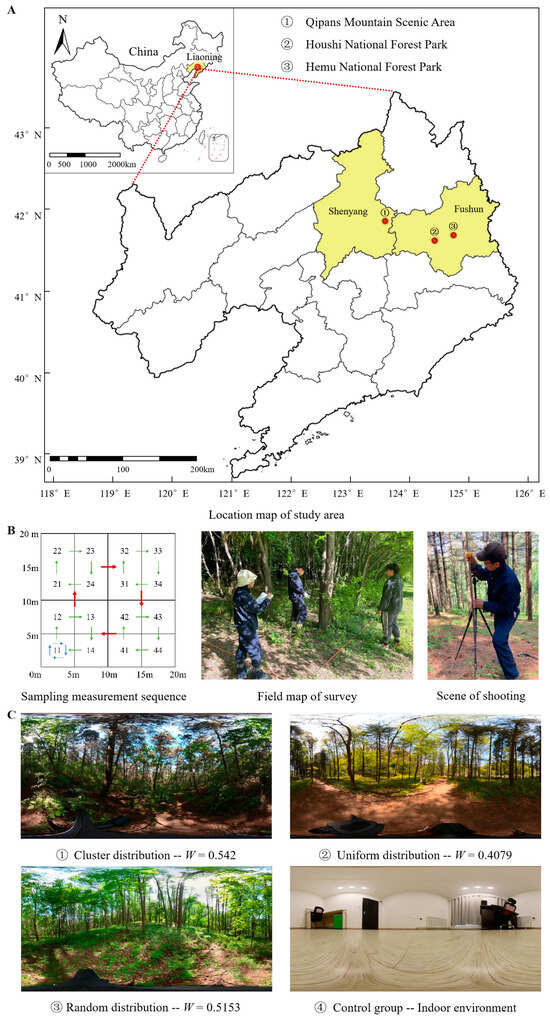 (1) Based on the representativeness and universality of the forest environment, the Qipans Mountain Scenic Area, the Houshi National Forest Park, and the Hemu National Forest Park in the northern part of China were identified as the research sites after on-site investigation and screening (Figure 1A).
