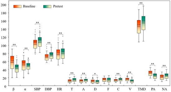 Differences of users’ physiological and psychological indices between baseline and pre-test. Note: *: p < 0.05; **: p < 0.01.