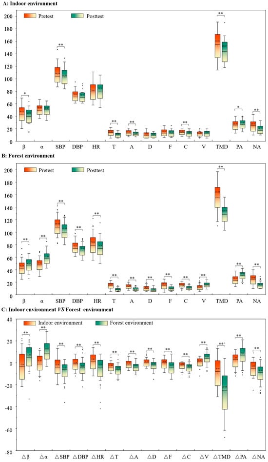 After users experienced the indoor environment and the forest environment, their psychological indices such as T, A, D, F, C, and TMD all showed a downward trend (Figure 4A,B), and the decline degree of the forest environment was significantly higher than that of the indoor environment (p < 0.05, Figure 4A,C).