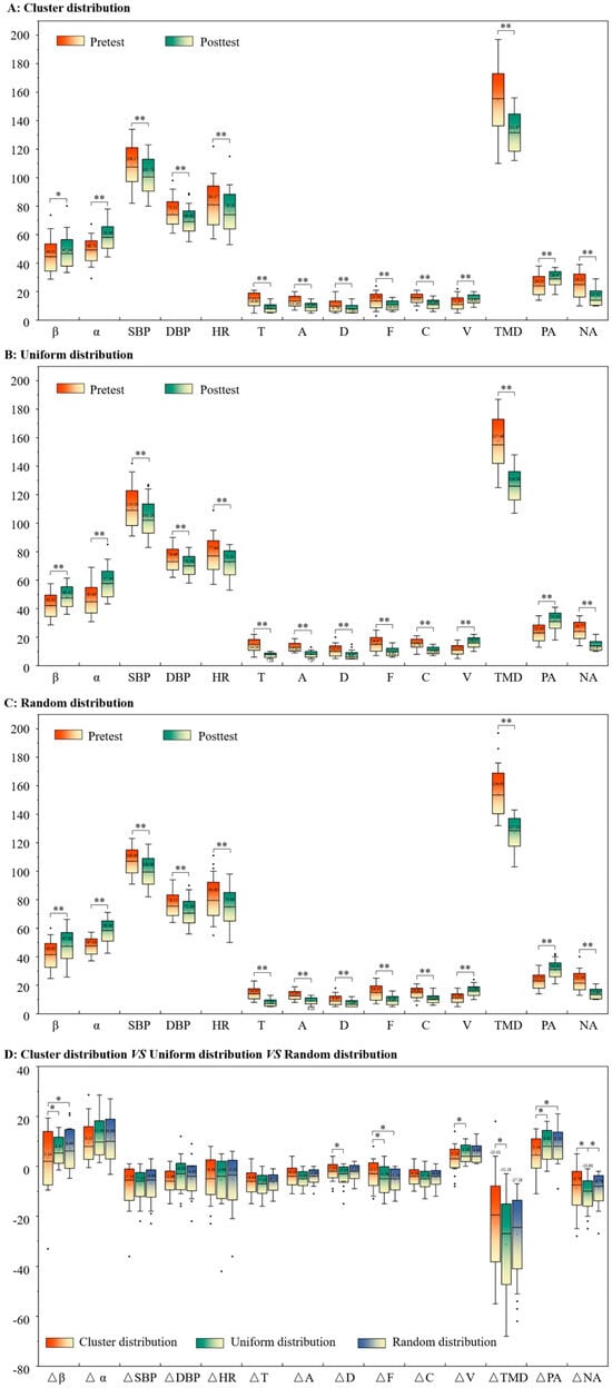 To explore this problem, first, we used the Wilcoxon test to analyze users’ restoration effects in three types of forest environment: cluster distribution (N = 50), uniform distribution (N = 49), and random distribution (N = 48). Second, we used the Kruskal–Wallis test to analyze the value of Δ in three kinds of forest environment (N = 147), and obtained the results shown in Figure 5. Figure 5 shows that, overall, users’ physiological and psychological recovery under different vegetation distribution showed the same trend, but the recovery degree was different.