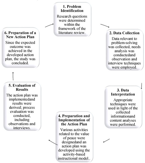 In this research, the aim is to develop and evaluate the effectiveness of peace education for preschool children. To achieve this goal, the research is designed using the action research method, which is a qualitative research approach. Action research focuses on solving everyday problems, is conducted within small groups, and is a process-oriented research method that is particularly useful for educators [42]. Action research is commonly used for various purposes, including developing school-based programs, professional development, system planning, school restructuring, and as an evaluation tool. It typically consists of six stages or phases. These stages involve problem identification, planning, action, observation, reflection, and then the revision of actions based on reflection. This iterative process allows for continuous improvement and problem-solving within the educational context [43]. In this context, the research has been planned as follows (See Figure 1).