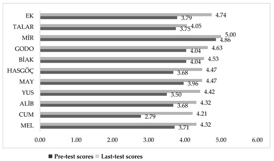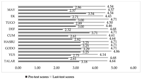 In Figure 5, the attitudes of each child toward peace values before and after the application are given according to the teacher. When the graph is examined, it is stated that all of the children in the study group showed positive increases in their attitudes towards peace values after the application. Despite using the same data collection tool as parents, the results obtained differed. It is thought that this result may be related to the fact that children’s behaviors in the home environment and in the classroom environment may be different.