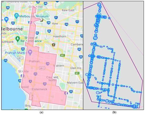 Melbourne, comprising over 5 million residents, is Australia’s largest urban population center [73]. The selected study area (Figure 1) focuses on several inner suburbs in Melbourne’s southeastern region, including vital bottleneck routes within some of the city’s most congested corridors. These corridors play a significant role in Melbourne’s urban mobility, heavily relying on road-based public transport, mainly buses. Furthermore, the selected case study zone enjoys well-developed access to various forms of public transportation, including conventional buses equipped with MyKi smart card readers.
