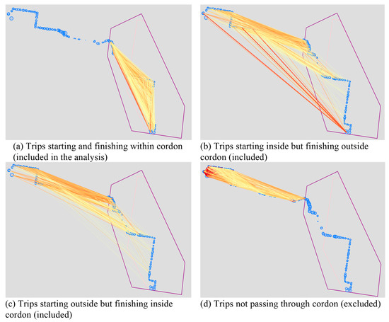 The smart card data facilitated a more comprehensive comprehension of prevailing bus passenger demand characteristics, ultimately contributing to the development of simulation models that are not only more pragmatic but also highly credible. The dataset included details for all bus routes, covering 18 service routes in both directions, as specified in Table 2. The dataset included all trips where at least one end of the journey (either start or finish) occurred within the study area. Trips that solely passed through the study area without making stops were excluded from consideration. Figure 2 provides visual examples of relevant trips for bus route 220. By applying these inclusion and exclusion criteria, a total of 225,548 viable trips within the period of 1–27 May 2018 were utilized for this study. This dataset served as the foundation for constructing the simulation model, covering an expanse of 35.3 square kilometers. The model incorporated 462 bus stops and 18 bus routes, constituting 36 round trips traversing the study region.