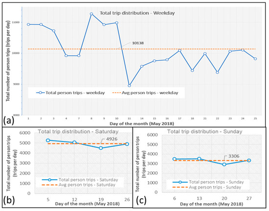 (a) Weekday, (b) Saturday, and (c) Sunday bus passenger trip distribution (person trips per day).