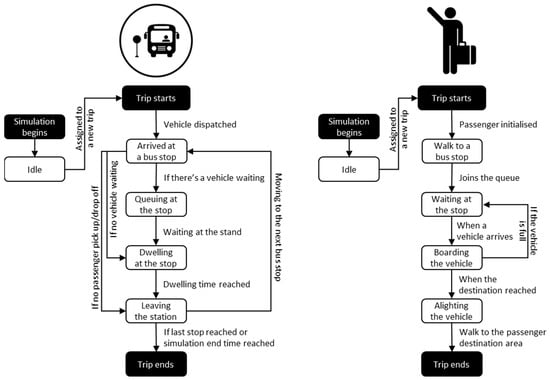 The main active agents are the on-demand buses/scheduled buses and passengers, and their state and transition from entering the network to leaving the network are presented in Figure 4.