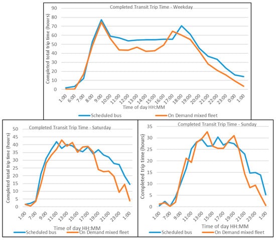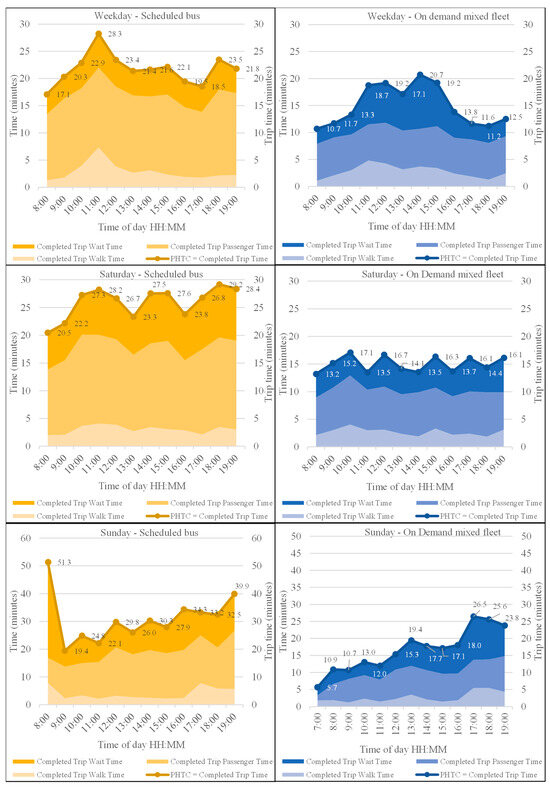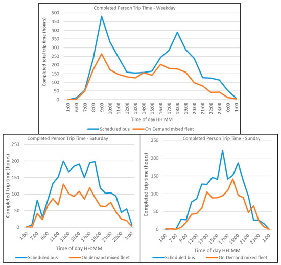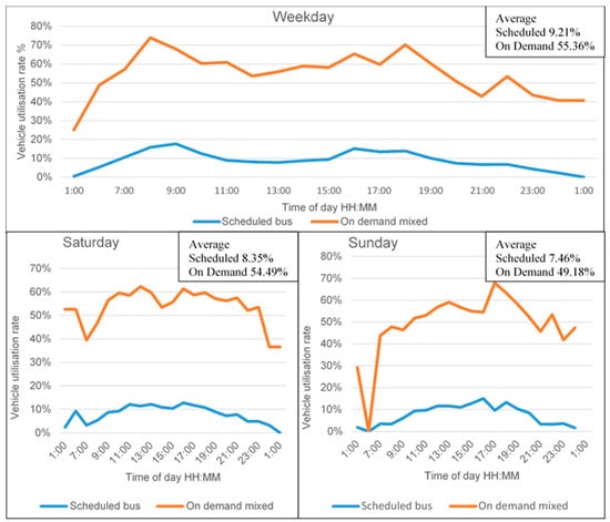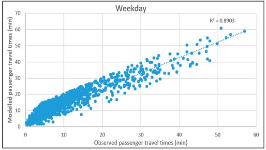 In recent years, the widespread use of public transport smart card data has offered new opportunities to evaluate and improve the performance and reliability of public transport systems [67,68,69]. This study evaluates the issues impacting on-demand public transport performance by employing agent-based traffic simulation models to understand the conditions necessary for successfully deploying these services and their impacts and benefits compared to existing scheduled bus services. Specifically, the Commuter traffic simulation tool developed a case study using real-world smart card passenger demand data. The model was calibrated and validated before running and evaluating different scenarios, providing full-day operational analyses for both weekdays and weekends.