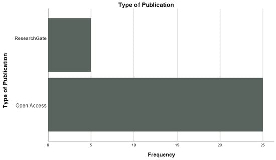 This literature review reviewed publications of two different kinds. The literature review reviewed research articles available as open access publications and papers not available as open access but full access on ResearchGate. There were 30 research papers reviewed for the literature review; 25 were available as open access while 5 were not available in open access, which were available on ResearchGate as full papers. Figure 4 presents the publication type by open access or full access on ResearchGate (Berlin, Germany).