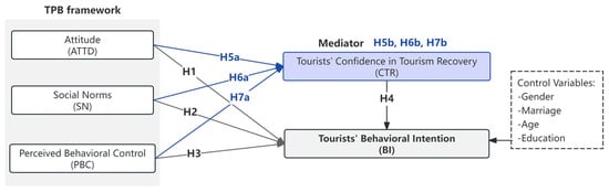 Notably, rebuilding tourists’ confidence in the recovery of the tourism industry has been highlighted as a crucial path to economic restoration in some research [,,,]. Dissimilar to previous studies, our research integrates CTR with the Theory of Planned Behavior (TPB), aiming to provide a comprehensive understanding of tourists’ behavioral intentions in the context of post-pandemic sustainable recovery of tourism.