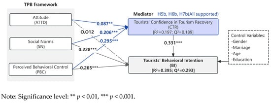 This increased confidence enhances their intention to travel, aligning their personal attitudes with positive social norms. Recovery confidence serves as a bridge in this process by providing assurance that traveling is not only socially endorsed but also safe []. Given the crucial influence of tourists’ confidence on the relationship between, particularly in the context of post-crisis recovery, the following hypotheses are proposed: