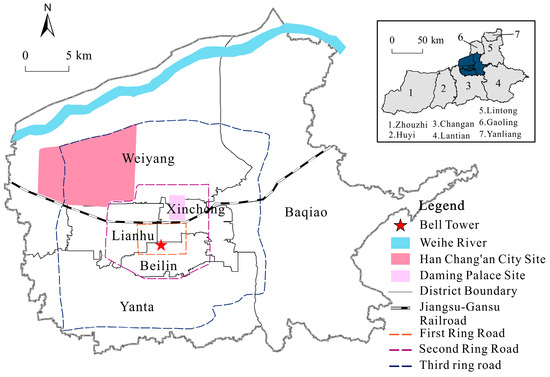 Although Xi’an has 11 districts and 2 counties under its jurisdiction, due to the withdrawal of counties and the establishment of districts, there are problems such as statistical differences and time inconsistencies between the main city and other districts and counties. Therefore, the research object of this paper is the main urban zone including Xincheng, Beilin, Lianhu, Weiyang, Yanta, and Baqiao (Figure 2).