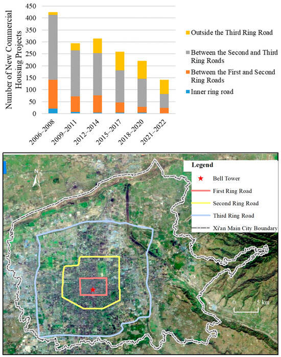Changes in the number of new commercial housing projects and the distribution of ring roads in Xi’an.