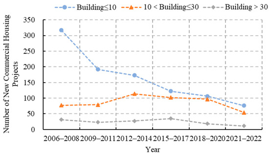 On the other hand, the size of new commercial housing projects is dominated by medium- and small-scale projects. Assuming that the project is homogeneous buildings, the size of the project is measured by how many buildings there are, with ≤ 10 buildings as a reference for small scale and ≤30 buildings for medium scale. There were more small-scale projects (509) in the early years (2006–2011), accounting for 51.62% of the number of projects in this category (986), with a gradual decrease in the middle and late years. Medium-sized projects increased and then decreased, with more (216) in the medium term (2012–2017), accounting for 41.3% of the number of projects in this category (523). There were fewer large-scale projects overall (Figure 5).