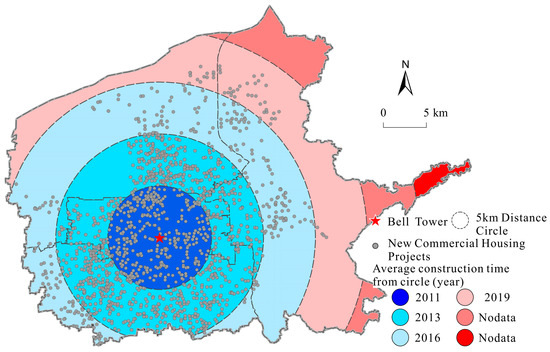 Meanwhile, the spatial expansion of new commercial housing projects in Xi’an has shown a clear trend of outward expansion. Taking the Bell Tower as the center of the circle and every 5 km outward as a standard circle, the average construction time of new commercial housing in each circle is calculated, and it can be seen that the years from the center of the circle outward are 2011, 2013, 2016, and 2019, respectively (Figure 6). The closer the commercial housing is to the center, the earlier it is built, and the closer it is to the peri-urban areas, the later it is built, which is a direct indication of sprawl and the phenomenon of housing suburbanization.