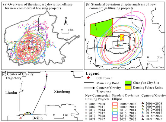 Meanwhile, the construction of new commercial housing extends from 2006 to 2022 from within the walls of the city center to the new urban zones, and the overall trend of new commercial housing shows a tendency to expand from the inner city to the outer city. The migration distance between the center of gravity of new commercial housing in 2015–2017 and 2018–2020 is the largest, with a clear shift to the northeast (Figure 8c). This suggests that as Xi’an continued to grow over time, the southwest corner of the city developed earlier and continued to widen the area for new commercial housing construction to the Weiyang and Baqiao districts in order to meet the city’s expansion.