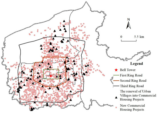 The commercial housing projects converted from urban villages account for the proportion of 84.16% outside the Second Ring Road, and are equal to 59.4% between the Second and Third Ring Roads. In addition to the national housing policy, this spatial distribution pattern is also influenced by the following factors.