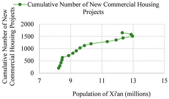 Fourthly, population demand is a direct driver of housing growth. Data analysis shows a positive correlation between population and projects. As the population grows, the correlation is highest from 2006 to 2010, the growth rate slows down from 2011 to 2020, and a negative correlation occurs in 2021–2022 (Figure 12). Xi’an’s growth has attracted a large number of people from neighboring cities. The expansion of the city’s population has led to a significant increase in housing demand. Newly built commercial housing has become an important part of people’s lifestyles and consumer culture. The period 2021–2022 saw a decline in population but an increase in the number of commercial housings, which is a phenomenon arising from the development of the city to a certain scale. The lag of commercial housing causes it to delay making changes. There is no doubt about the contribution of population to housing in the study period.