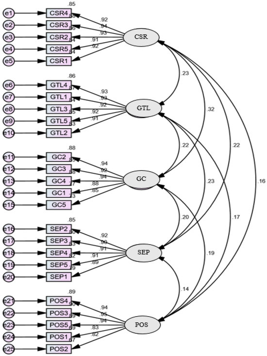 The main conclusions of the exploratory factor analysis (EFA) are shown in Table 3. Factor analysis was supported by the correlation matrix analysis, which verified substantial relationships between the measurements. The number of factors was ascertained by using the eigenvalue, and the Kaiser–Meyer–Olkin measure was 0.903, suggesting that it fell within a reasonable range. The correlation matrix suited the data well, according to Bartlett’s sphericity test (p < 0.000). The 25 measures’ communalities varied from 0.872% to 0.960%, indicating a high degree of shared variation that the components may account for.
