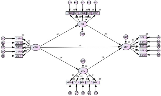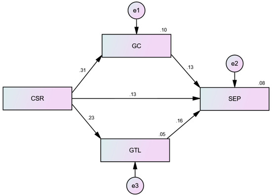 This study employed bootstrapping to evaluate the mediating effects within the model, following the guidelines established by Baron and Kenny [61]. Bootstrapping facilitates an indirect effect on the independent variable via a mediator. Table 7 demonstrates that the correlation between CSR and SEP is significantly mediated by both GC and GTL. The indirect effects are CSR→GC→SEP = 0.037 and CSR→GTL→SEP = 0.034, corroborating H6 and H7 in the bias-corrected model with a 95% confidence interval. Moreover, Table 7 demonstrates that the p-value for all indirect effects is below 0.05, and the lower and upper bounds of all mediations are positive, indicating that all relationships are statistically significant. Figure 4 illustrates the results of the pictorial mediation analysis.