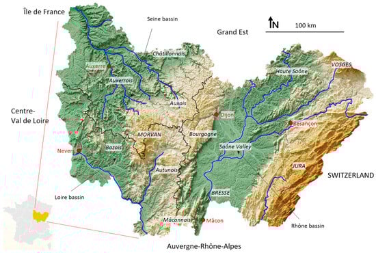 The Bourgogne-Franche-Comté region, located in the center-east of France (Figure 1), is composed of eight administrative departments: Côte-d’Or, Jura, Haute-Saône, Nièvre, Yonne, Saône-et-Loire, Territoire de Belfort, and Doubs. Covering an area of 47,784 km2, it is the fifth-largest administrative region in France. The region spans an altitudinal range from the Saône plain and the Seine valley (~170 m) to the peaks of the Vosges (1247 m) in the northeast and the Jura (1495 m) in the east. The Morvan Massif (901 m) occupies the center of the region. Bourgogne-Franche-Comté is bordered by the Centre-Val de Loire region to the west, Île-de-France to the northwest, Auvergne-Rhône-Alpes to the south, Grand Est to the north, and Switzerland to the east (Figure 1). The eastern half of the region lies within the Rhône basin, while the western half corresponds to the upper basins of the Loire and Seine, which flow, respectively, towards the Atlantic Ocean and the English Channel.