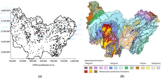 (a) Location of the 989 groundwater catchments; (b) simplified geological map of the BFC region (adapted from BRGM, https://www.brgm.fr/fr/implantation-regionale/bourgogne-franche-comte, accessed in January 2024).