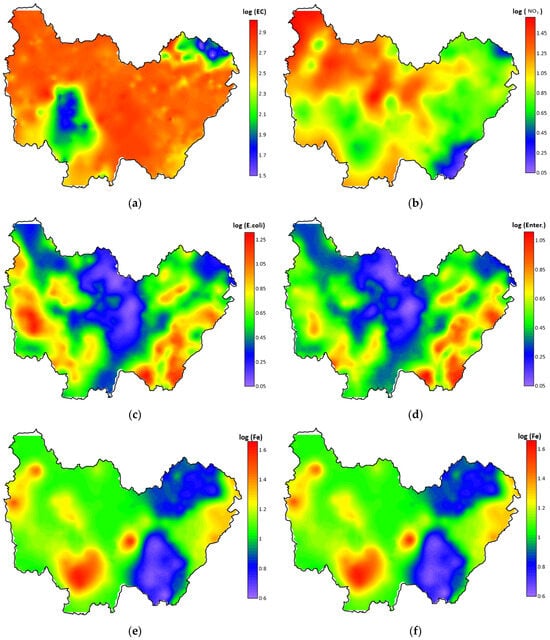 Distribution maps for parameters (a) EC (proportional to the sum of major ions), (b) NO3 (sensitive to agricultural pollution), (c) E. coli and (d) Enter. (representing fecal contamination), (e) Fe (trace metal element), and (f) arsenic. All the maps were drawn using the variogram calculated based on all the data (VarTot). Units are µS cm−1 for EC, mg L−1 for major ions, nitrates, and traces, and number of cells per 100 mL for bacteria.