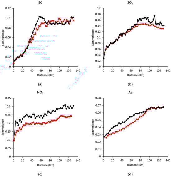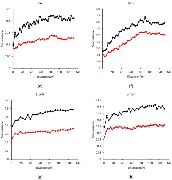 Examples of variograms obtained for (a,b) EC and major ions, (c) nitrates, (d) As, (e) Fe, (f) Mn, and (g,h) bacteriological parameters. For all the graphs, the black lines and symbols represent the variogram calculated using all the data (VarTot), and the red lines and symbols represent the variogram calculated using the mean of the parameter at each measurement point (VarMean).