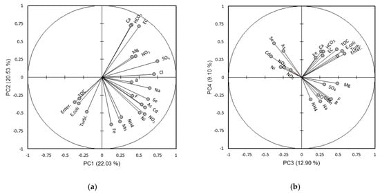 Distribution of the parameters in the factorial plans (a) PC1–PC2 and (b) PC3–PC4.