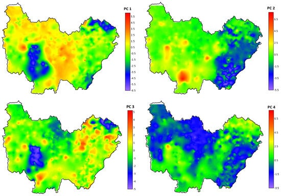 The second principal component, explaining 20.5% of the variance, contrasted calcium-carbonate-mineralized waters with diluted waters, which were also affected by fecal contamination and heavy metals. Notably, the diluted waters were associated with reduced forms of nitrogen (ammonium and nitrites) and metals (Fe, Mn) and metalloids such as selenium and arsenic, typical of metalliferous deposits. This redox gradient suggested that the diluted waters are likely subsurface waters, characterized by higher turbidity and total organic carbon (TOC) levels, similar to runoff waters during rainy events. The most negative values on this axis, indicating higher fecal and metal contamination, corresponded to the Jura massif, while the most positive values (Figure 7) were found in the alluvium of the Saône and Bresse plains and the elevated areas around the Morvan (Mâconnais, Autunois, Bourgogne plateaus, Bazois).