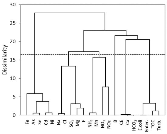 The result of the clustering performed on the 22 parameters, based on the first 10 principal components, which account for 90% of the information carried by the dataset, is presented in Figure 8. The positioning of the phenom line allowed for the distinction of six groups. The first group consisted of metals and metalloids, except for manganese. The second group included major ions and fluorides, except for calcium ions and carbonates. The third group comprised different forms of nitrogen and manganese. Boron was an isolated parameter. The fifth group linked electrical conductivity with the major ions Ca and HCO3, and the last group was related to fecal contamination, always associated with the turbidity and TOC.