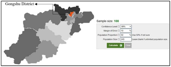 Given the sheer number of existing buildings, it is generally impractical to conduct an analysis on each individual building. Consequently, it is essential to establish typical prototypes that can represent a particular type of building []. Therefore, this study aims to develop a typical model for existing high-rise office buildings by investigating the factors influencing their carbon emissions. The research area chosen was Gongshu District, Hangzhou City (left in Figure 1). According to relevant statistical data, there are 245 high-rise office buildings within the surveyed area. Following the principles of the sampling survey, and under the premises of a 99% confidence level and a 10% margin of error, the sample size for this study was set at 100 buildings (right in Figure 1).