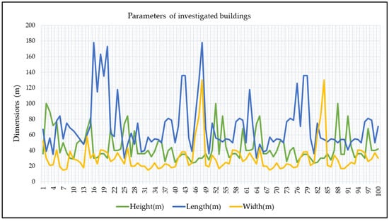 The plan forms of the high-rise office buildings surveyed in this study can be primarily categorized into three types: rectangular, L-shaped, and U-shaped. Among them, there were 64 rectangular samples, 27 L-shaped samples, and 9 U-shaped samples. This subsection exemplifies the extraction process of a typical model using the aforementioned algorithm, with a focus on rectangular buildings oriented south–north (abbreviated as R-NS). Figure 2 presents the distribution of relevant data for the surveyed rectangular buildings.