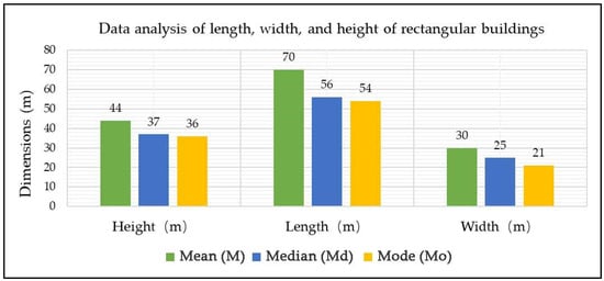After calculation, the M, Md and Mo values of the relevant data for R-NS high-rise office buildings are presented in Figure 3 (the results are rounded to integers for easier comparison and analysis). It can be observed that for the R-NS buildings, the data for length, width, and height all exhibit a skewed distribution, with M > Md > Mo. Notably, the Md and Mo values for height and width are relatively close. Therefore, the average of these two values can be taken as the typical height (37) and width (24) for the model.