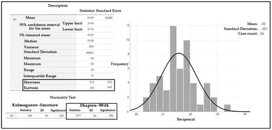 The substantial difference between the Md and Mo values of the length data for R-NS office buildings necessitated a normality analysis for this data set. The preliminary normality analysis revealed a skewness of 2.550, a kurtosis value of 7.151, and p-values from both the Kolmogorov-Smirnov (K-S) and Shapiro-Wilk (S-W) tests that were less than 0.05, indicating a skewed distribution for this data set. Due to the high skewness Z-score and high dispersion at both ends, the data set was transformed into its reciprocals before conducting another normality analysis. The results of this analysis are presented in Figure 4. After the reciprocal transformation, the S-W test yielded a p-value of 0.400, which is greater than 0.05. Additionally, the histogram visually demonstrates a normal distribution, allowing the transformed M value to be taken as the typical value for the length of R-NS buildings. Converting the M value back to its original scale by inverting the reciprocal, the resulting M value represents the typical value for the original data set. The same steps were repeated to obtain the typical data for the window-to-wall ratios of various building facades. The final data for the typical R-NS model are summarized in Table 1.