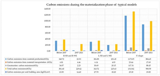 (2) During the embodied phase and the demolition phase, the retrofitting carbon emissions of the same model constructed in the same era were identical, primarily due to the uniform material inputs. For buildings constructed before 2007, the emissions during the retrofit process averaged between 23.9 kgCO2/m2 for rectangular buildings and 27.7 kgCO2/m2 for L-shaped buildings. For buildings constructed between 2007 and 2021, rectangular models had the lowest emissions, averaging 14 kgCO2/m2.