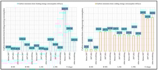 Overall, the heating-related carbon emission reductions achieved through retrofitting high-rise office buildings constructed between 2007 and 2021 only accounted for 3% of those achieved in buildings built before 2007. Thus, from a heating-related carbon mitigation perspective, retrofitting high-rise office buildings constructed before 2007 offers greater potential benefits. Ranking the carbon reduction potential of these older buildings, U-shaped buildings emerged as the top priority, followed by R-WE, L-WE, L-NS, and R-NS buildings. This ranking highlights the significant influence of orientation on heating-related carbon reductions within the same typological model. For instance, the R-NS model built before 2007 achieved an 18% reduction in heating-related carbon emissions compared to the R-WE model, primarily due to the latter’s limited solar gain during winter, leading to inherently higher carbon emissions (1192.66 tons CO2/a > 273.99 tons CO2/a). After retrofitting, although the rectangular model with an east–west orientation still emitted more carbon than its south–north counterpart (161.7 tons CO2/a > 82.92 tons CO2/a), the magnitude of the reduction was greater for the former.