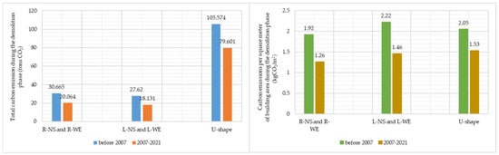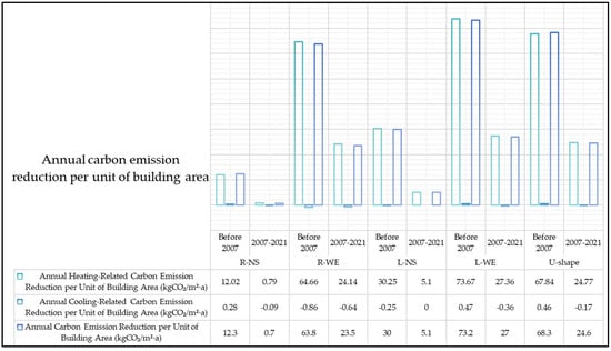 In a comprehensive assessment, the operational phase carbon emission reduction benefits of typical models constructed before 2007 were significantly higher than those constructed between 2007 and 2021 (Figure 8). Specifically, the L-WE model built before 2007 exhibited the highest carbon emission reduction benefit per unit area, at 73.2 kgCO2/a·m2. This was followed by the U-shaped and R-WE models of the same era, with respective benefits of 68.3 kgCO2/a·m2 and 63.8 kgCO2/a·m2. The R-NS and L-NS models built before 2007 showed benefits of 12.3 kgCO2/a·m2 and 30 kgCO2/a·m2, respectively. In contrast, the carbon emission reduction benefits of typical high-rise office buildings constructed between 2007 and 2021 ranged from 0.7 to 27 kgCO2/a·m2, with the R-NS model exhibiting the lowest benefit (0.7 kgCO2/a·m2) and the L-WE model the highest (27 kgCO2/a·m2).