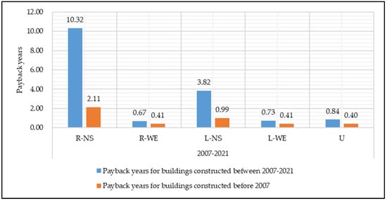 For high-rise office buildings constructed between 2007 and 2021, the R-WE typical model exhibited the shortest carbon emission payback period for retrofit at 0.67 years, whereas the R-NS typical model has the longest payback period at 10.32 years. This significant difference stemmed from the operational phase, where the carbon emission reduction achieved by retrofitting the R-NS model was far less than that achieved by retrofitting the R-WE model.