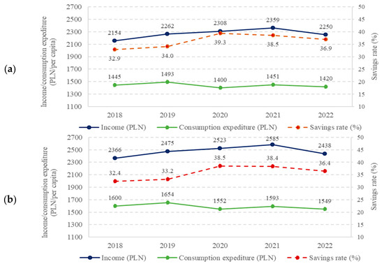 The savings rate of Polish households before the pandemic, specifically in 2018–2019, remained relatively stable at 33–34%. In this period, it increased by only 0.8 percentage points in urban areas and by 1.7 percentage points in rural areas. The outbreak saw a surge in the savings rate—over 5 percentage points in both urban and rural households, reaching 38.5% and 41%, respectively. This increase primarily followed a lockdown-induced drop in expenditures, further bolstered by a slightly rising income level. In subsequent years, however, growing access to services led to higher consumption, which, coupled with a decline in income levels in 2022, contributed to decreasing savings rates. Throughout the study period, the savings rate was higher in rural than in urban households—by as much as 2.5 percentage points in 2020, decreasing to below 1 percentage point in the second and third years of the pandemic (Figure 2). Savings accumulated during the pandemic could have resulted from precautionary reasons and the need to safeguard against unexpected expenses or income loss, but they could also have been a consequence of lockdowns, leading to forced savings. In the subsequent years of the pandemic, the rate decreased in both urban and rural households (by 2.1 and 3.3 pp, respectively). These results align with the findings of Szustak et al. [19], which indicate that Polish households are more inclined to use their savings to compensate for lower incomes rather than taking on debt in the form of credit or loans.